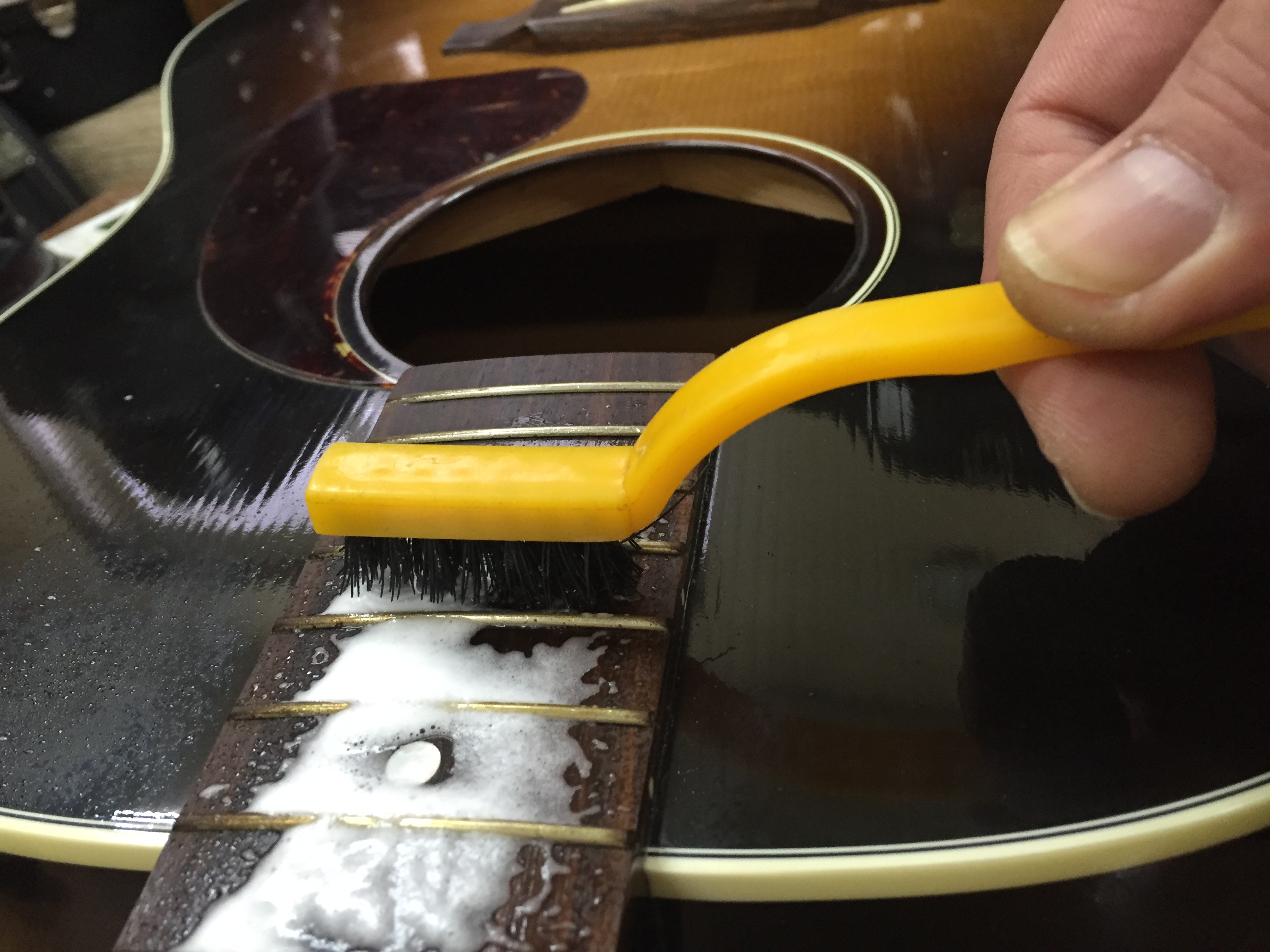 まずは、手垢やほこり汚れを除去。指板の場合は普通のマジックリン等は使わない様に!水分があまり指板に浸み込まないアルコール配合の汚れを浮かして除去できるスプレー缶を使用。